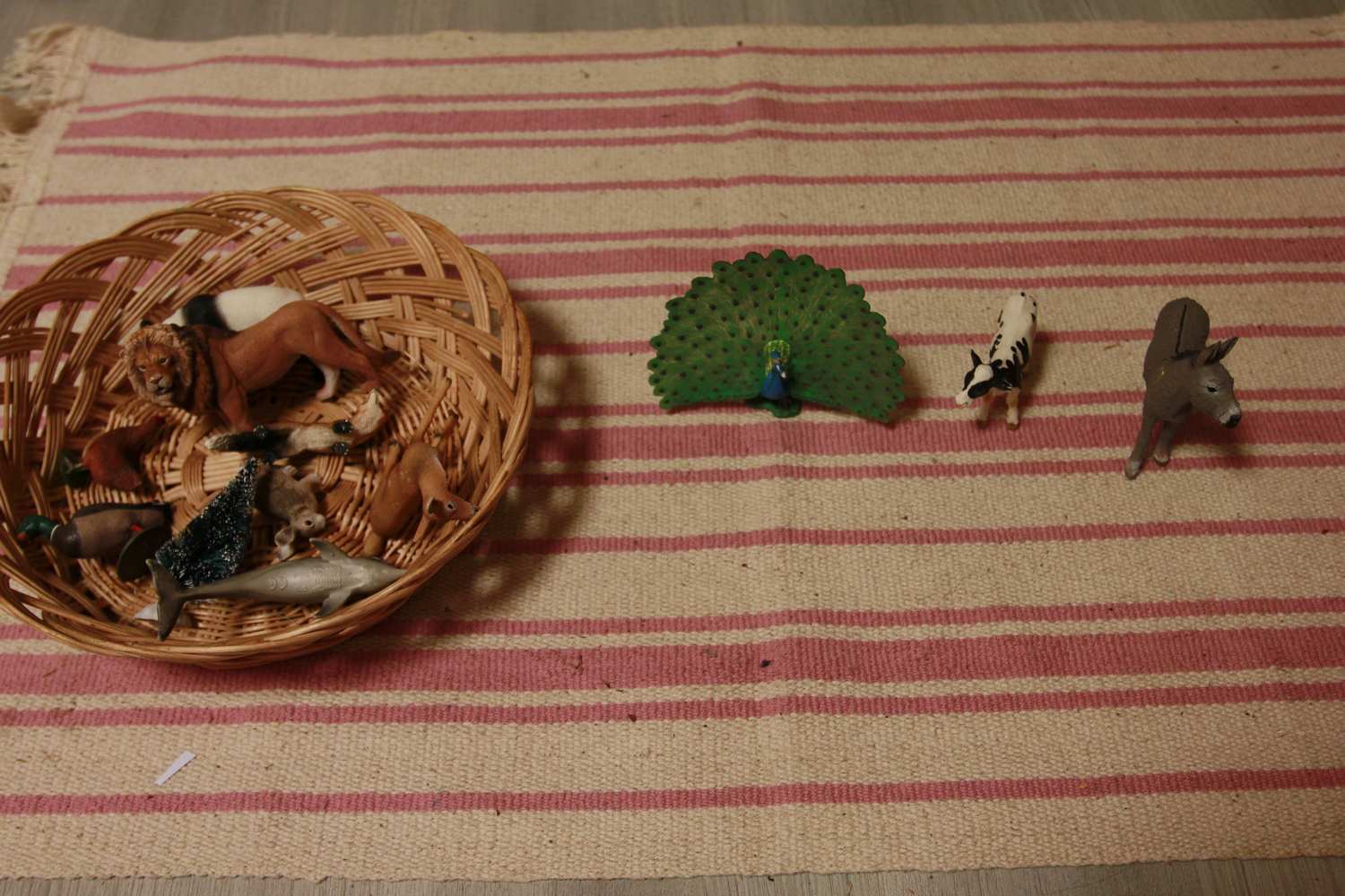 Matériel: Ici on utilise ce qu’on a sous la main, des figurines d’animaux, des objets de la vie quotidienne, (petits de préférence) et un plateau.