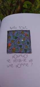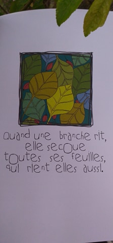 « J’ai écrit cette histoire comme on part se promener, sans savoir où j’allais, sans savoir quand je reviendrais. Je me suis perdu entre les lignes. J’aime me perdre. C’est une source de surprise si l’on sait observer. Au détour des pages j’ai rencontré des fleurs et des rameaux philosophes, des non-oiseaux, des fleurs d’un jour et puis je me suis trouvée. J’étais poisson,oiseau, écureuil, fleur, feuille, branche, arbre et même pierre. Je me sentis nager, voler, sauter.Je ressentis mes racines qui s’enfonçaient dans la terre, mes ailes qui me portaient au plus haut,ma légèreté de feuille, mon parfum de fleur et ma rudesse de roche.Je fus tout cela, non pas un mélange de tout, mais chaque chose, chaque être vivant à la fois. J’étais riche de toutes ces vies, si différentes et si semblable. »