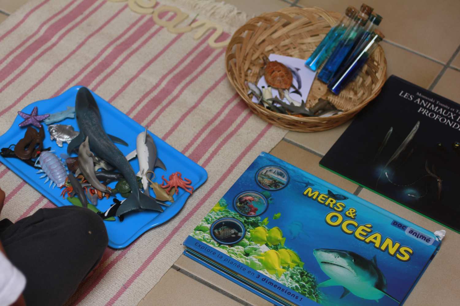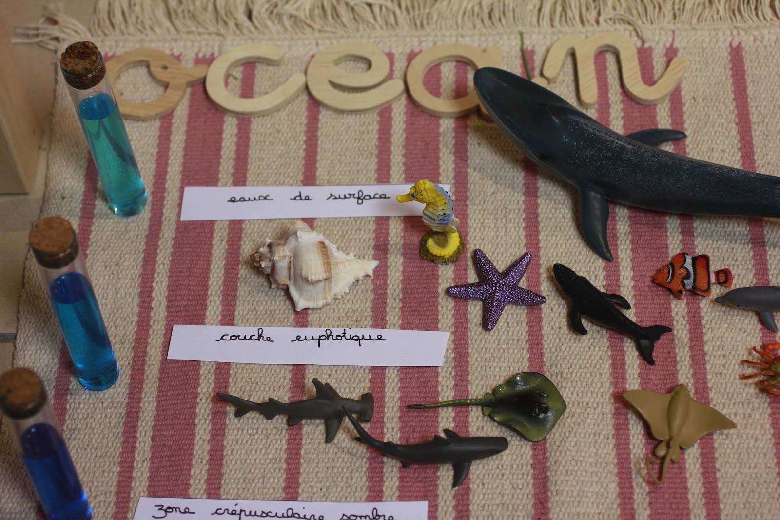 animaux marins, créatures des profondeurs, coquillages, tubes d’eau colorées pour représenter les différentes profondeurs de l’océan, galets, cartes de nomenclature,…