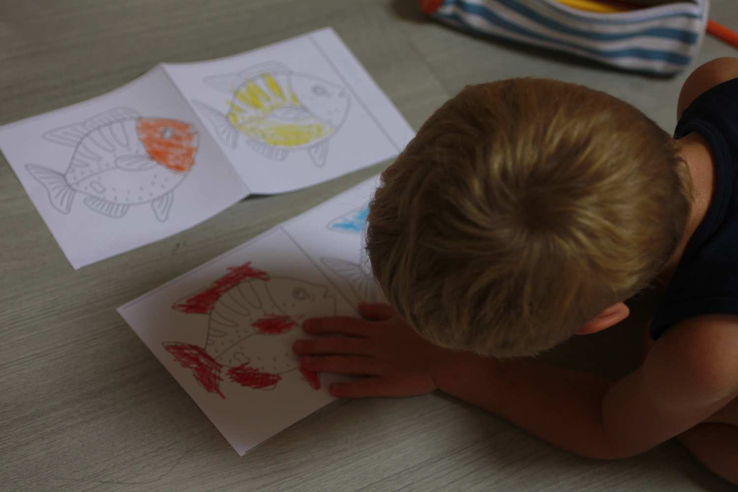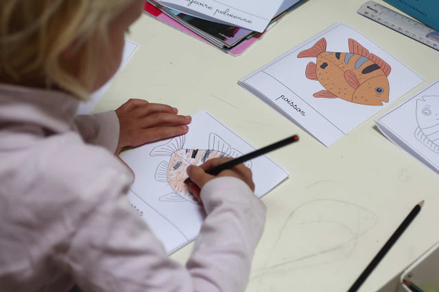 Puis carnet à colorier sur le poisson (avec consignes adaptées pour petit bonhomme, colorier juste l’oeil, le corps, la tête, les nageoires, et la nageoire caudale/queue)