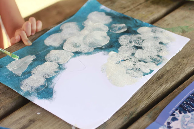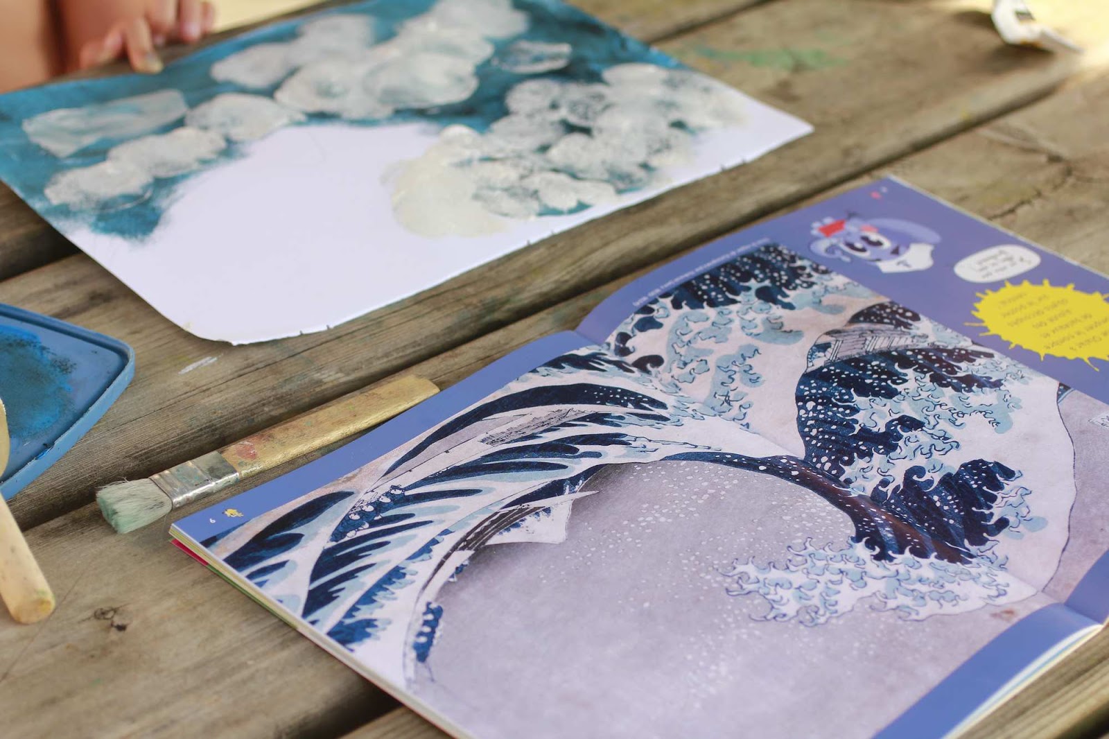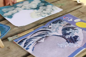 Lecture du magazine, discussion autour du célèbre tableau de la vague d’Hokusai puis peinture, gouache, pinceaux, éponges… pour refaire à leur tour le célèbre tableau.