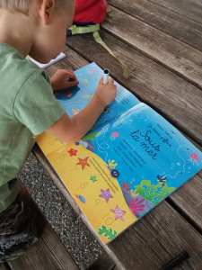 Pour petit bonhomme un cahier « je trace j’efface : sous la mer » des éditions usborne… avec des jeux de graphisme, dénombrement, labyrinthe. Sur un cahier aux pages plastifiées pour y écrire au feutre effaçable.
