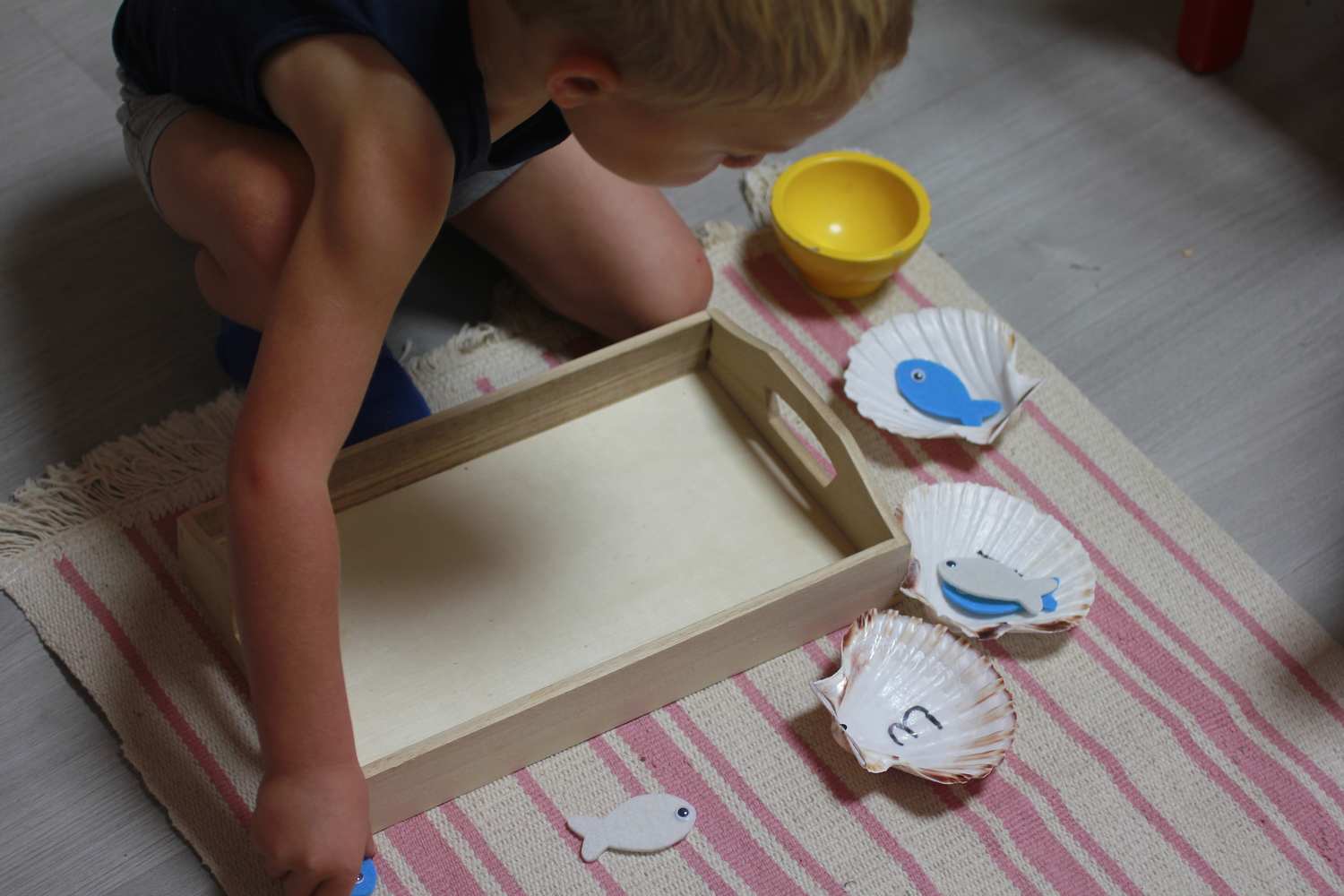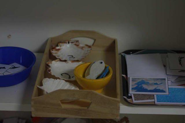 Un plateau de dénombrement avec des coquillages que j’avais récupéré et des poissons en feutrine. (Activité pour mon petit bonhomme, dénombrement jusqu’à 3 puis 5)