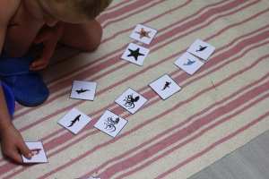 Un panier avec un jeu de mise en paire avec d’animaux marins et leurs ombres.