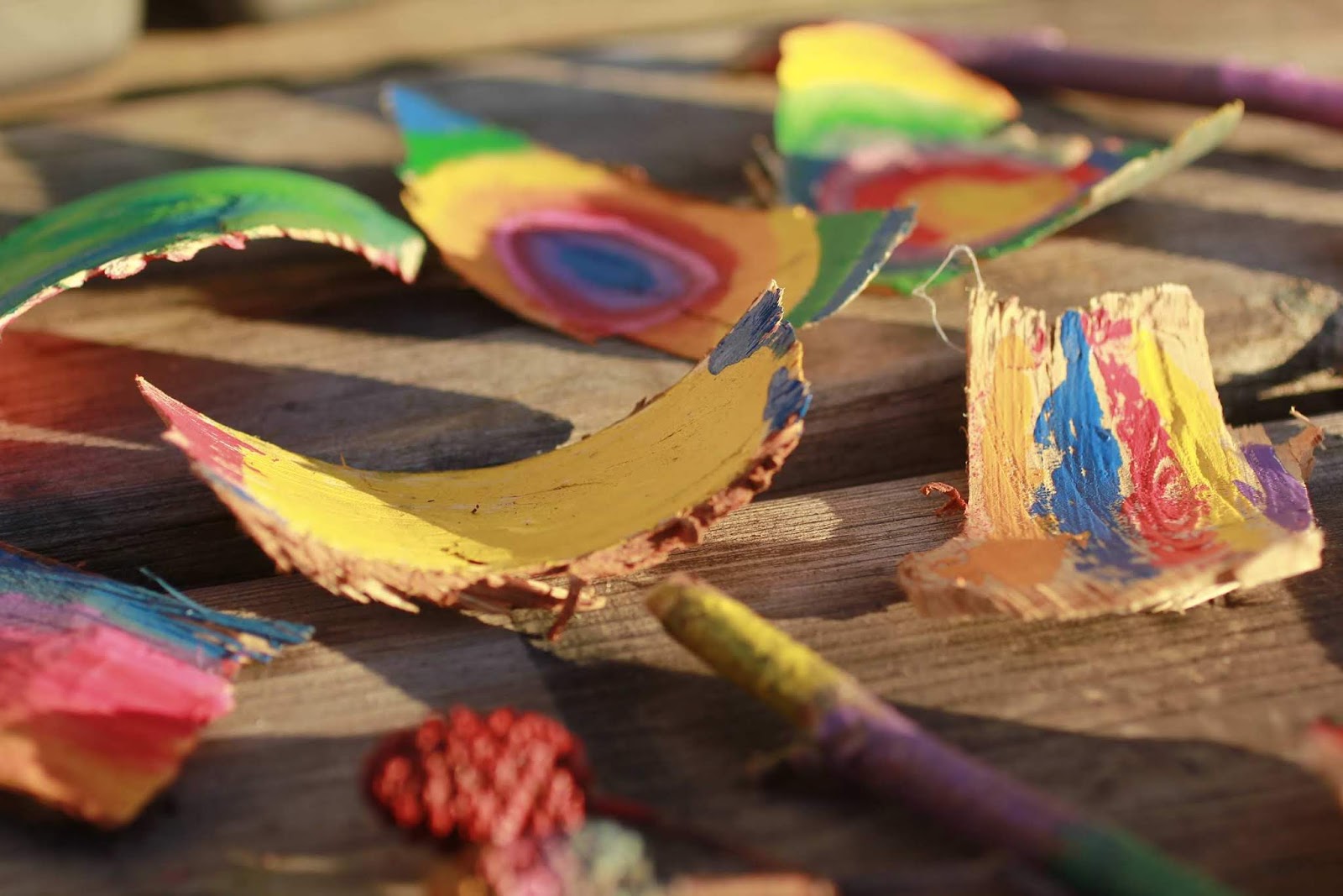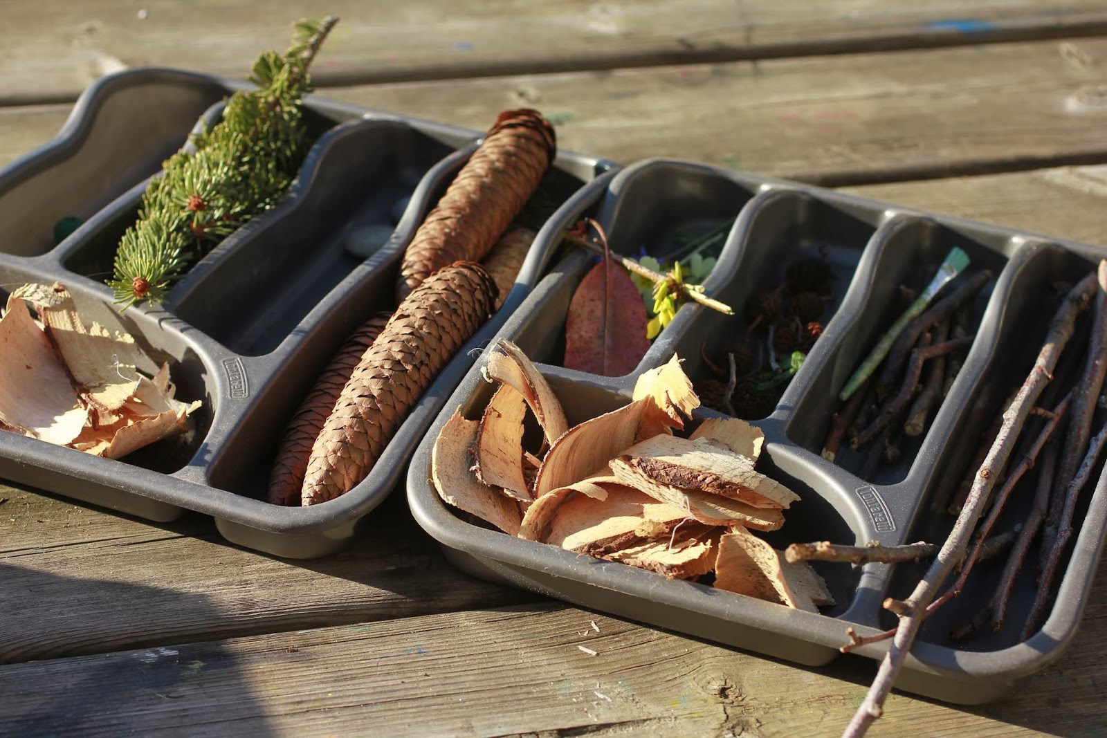 Nous avions prévu de réaliser un mobile printanier avec des éléments naturels et nous avons eu la chance de trouver pendant notre balade de belles écorces d’épicéa. Les enfants en ont ramassé plusieurs pour les peindre et les utiliser sur notre mobile. Je leur ai dont mis à disposition tout ce que nous avions ramassé et ce dont ils avaient besoin (fil, perles, aiguilles….) et nos tubes de peinture acrylique.
