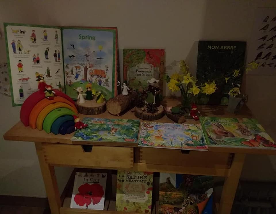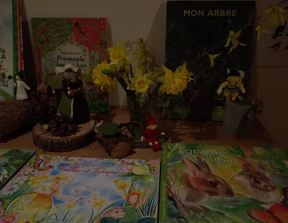 Et pour finir notre journée nous avons réaménagé notre table des saisons avec nos petites fées et Grand-Mère Nature, nos livres sur le printemps…