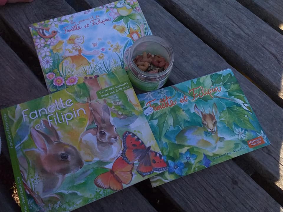 Une fois les petits enfants graines de Grand-Mère Nature retrouvés, les enfants ont trouvé un petit cadeau. Je leur avais commandé trois numéros sur le printemps de Fanette et Filipin. Une lecture en pleine nature au bord de l’étang avec les grenouilles qui commençaient à coasser.