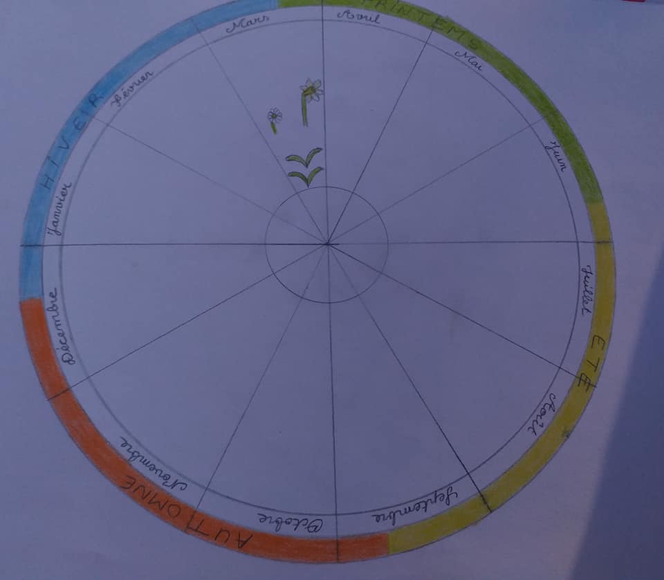 Nous avons aussi choisi de commencer notre roue phénologique avec l’arrivée du printemps. (billet plus long à venir sur le sujet). De manière à pouvoir consigner nos observations et voir comment la nature évolue au fil des saisons.