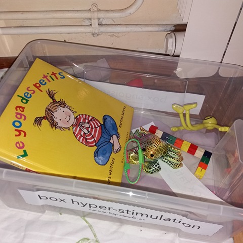 Pour la box hyper-stimulation/angoisse, qui sont chez nous les deux émotions venant se placer en concurrence de la colère/frustration, je pense y mettre :