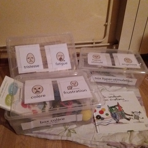 Des box émotions. Des boîtes pour chaque émotion (alors ici pour le gain de place j’ai regroupé deux émotions par boîte (celles utilisant des outils proches).