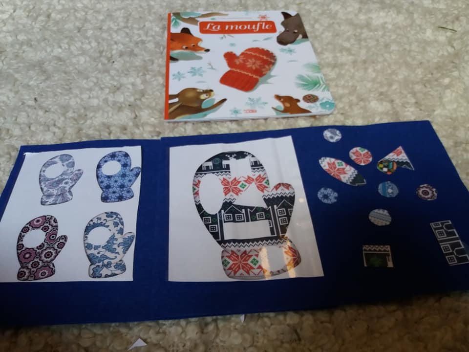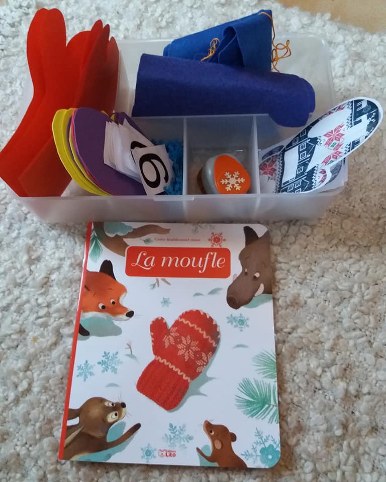 J’avais alors préparé un petit plateau et une petite boîte avec des petites activités autour du livre : dénombrement, mise en paire, couture de moufles en feutrine, raconter l’histoire avec nos figurines schleich, …. internet (pinterest) fourmille d’idées et j’ai utilisé certains des liens du blog de mon amie Maman fouine http://mamanfouine.over-blog.com/activites-autour-du-theme-de-la-moufle