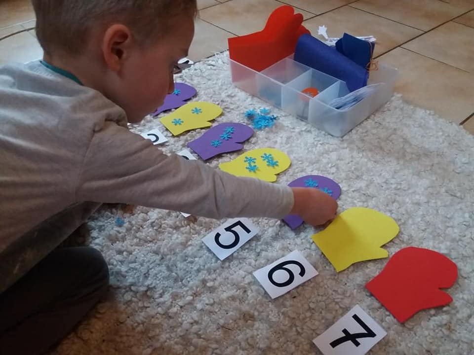 Dénombrement avec des moufles découpées dans de la feutrine et des flocons de neige que petit bonhomme avait fait avec la perforatrice.