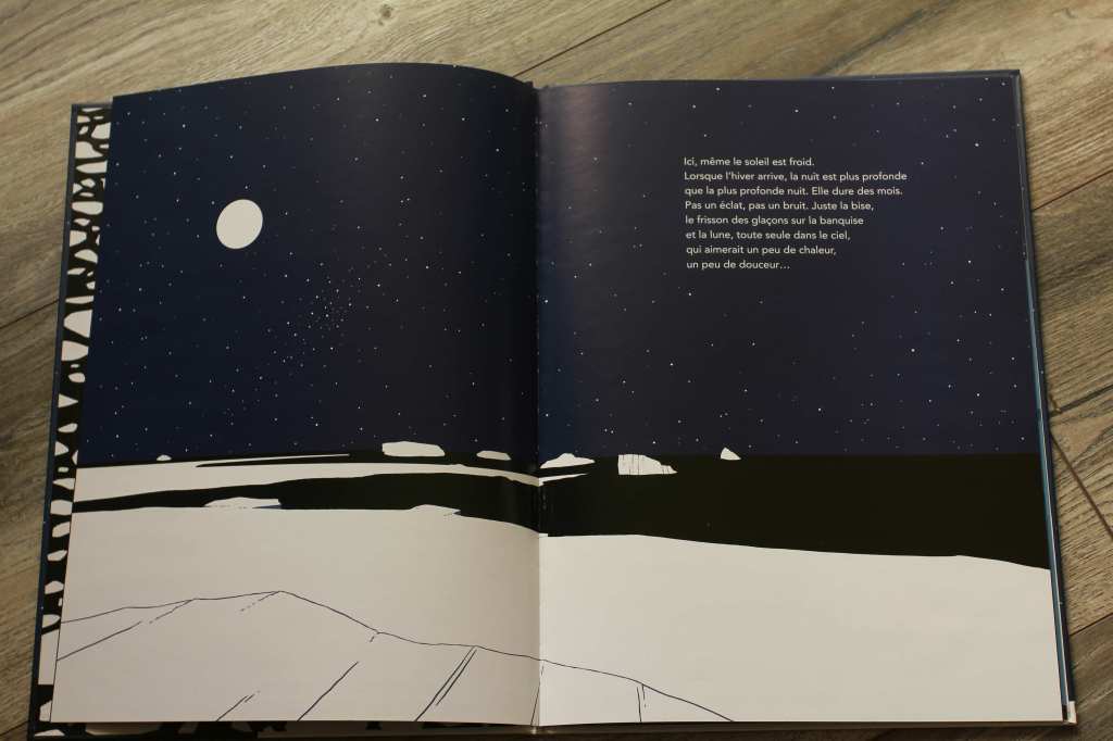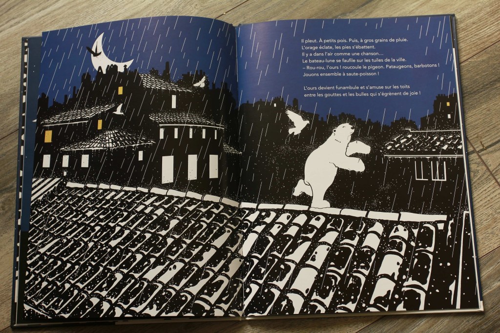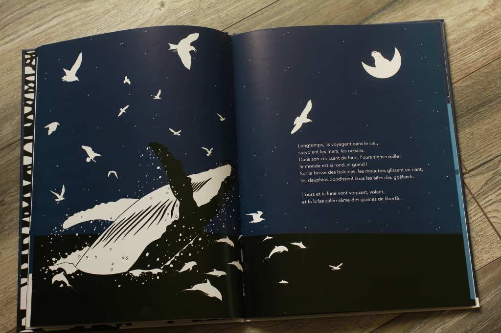 Ensemble ils voyagent autour du monde pour en découvrir les merveilles… les baleines à bosses, les mouettes, le désert et ses parfums épicés, la ville et ses pigeons…. les illustrations colorées de noir, de bleu sombre et de blanc sont magnifiques et nous emmènent avec l’ours et la lune dans ce voyage nocturne. Le choix des couleurs sombres nous portent vraiment au cœur de la nuit.