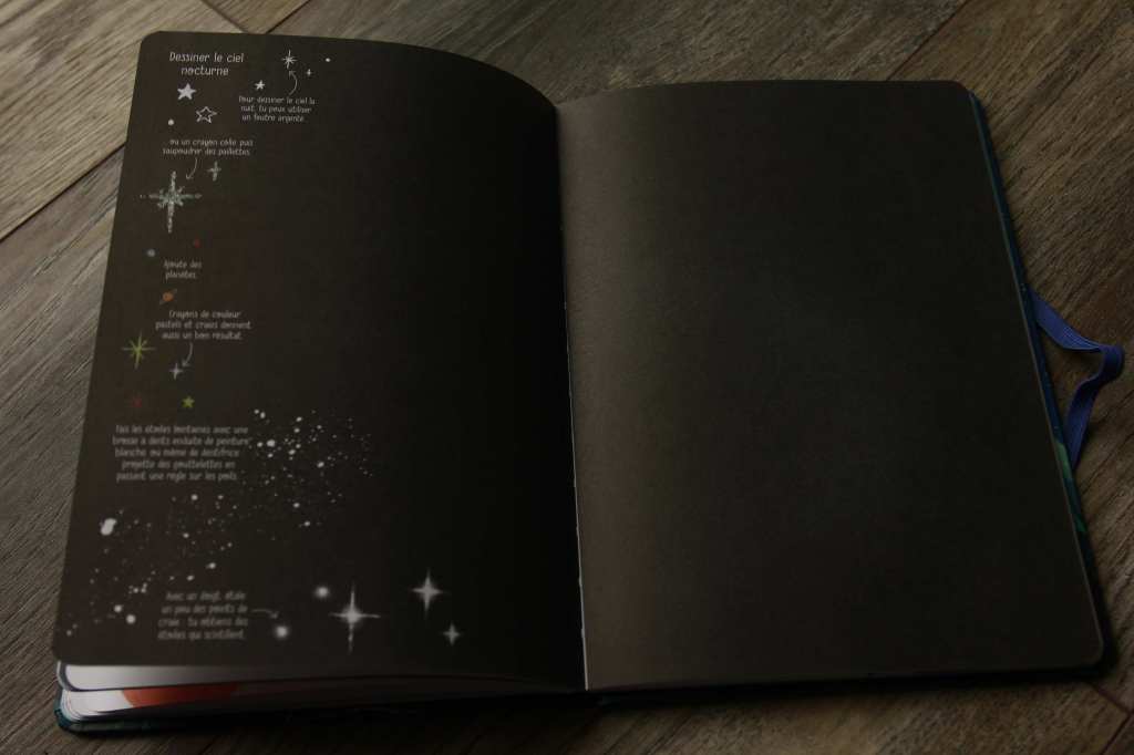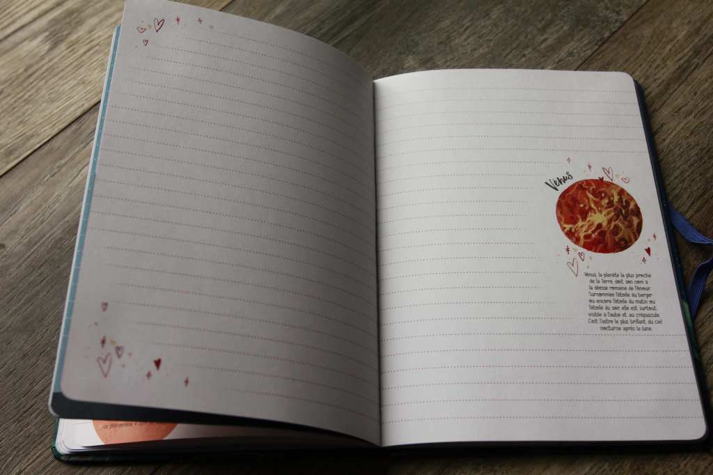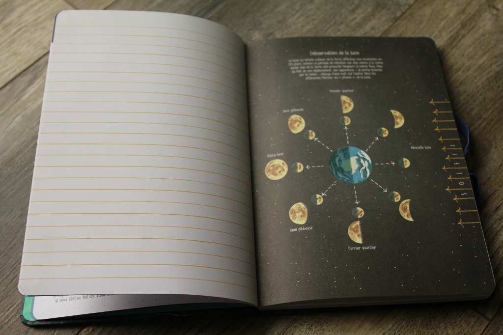 Des espaces blancs qui permettent de prendre des notes, ou de dessiner ce que l’enfant a observé. Des conseils pour observer le ciel, des informations pour en apprendre davantage…. (On y découvre ce qu’est une aurore boréale, ce qu’est une éclipse, ou encore comment la pleine lune est vue à travers différentes cultures, d’où vient le nom de la planète vénus, les différents cycles de la lune…) Des pages lignées pour permettre d’écrire plus facilement les phénomènes observés ou tout ce que l’enfant aurait envie de noter de ses découvertes autour des planètes, des étoiles…