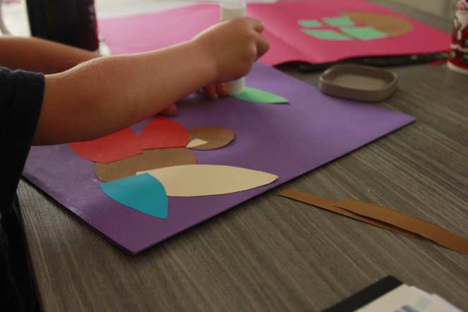 Graphisme pour petit bonhomme… avec des motifs graphiques à redessiner dans chaque plume de la dinde. Découpage et collage