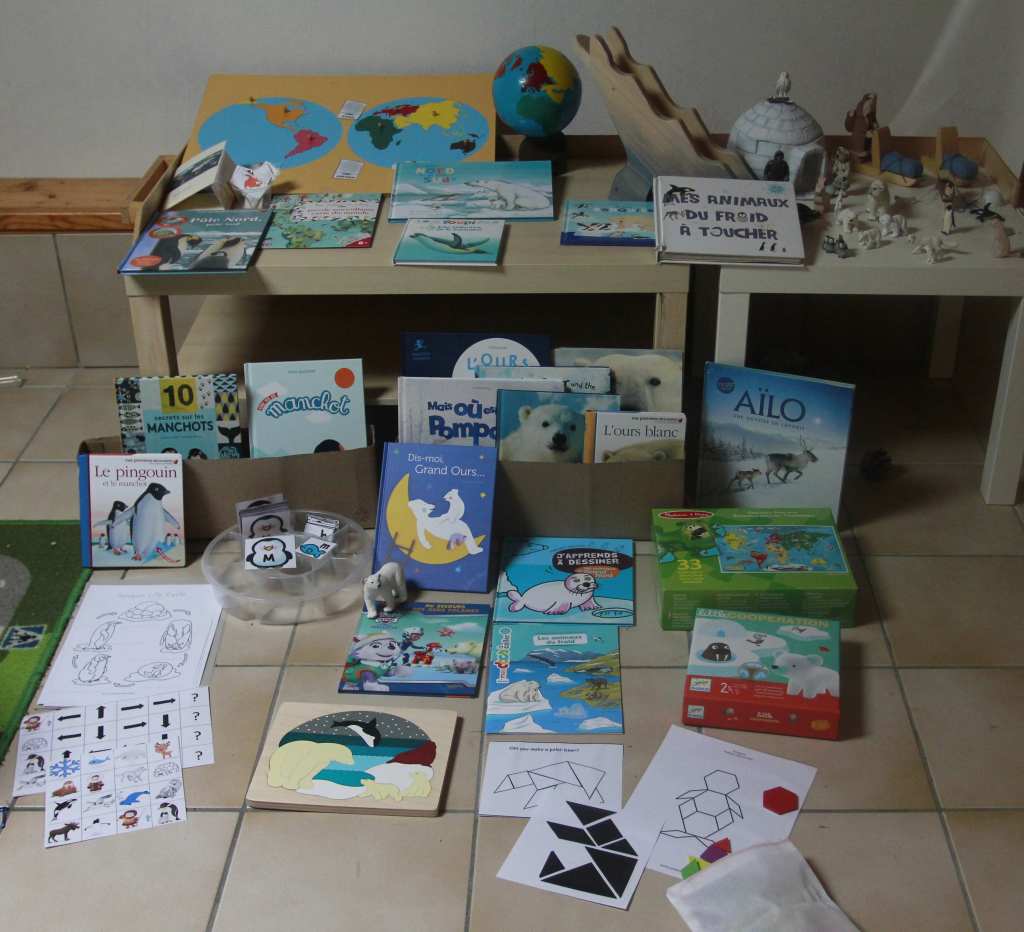 J’en ai donc profité pour sortir nos figurines schleich, et nos livres autour des ours polaires mais aussi de manière plus générale sur le pôle Nord et le pôle Sud. Le tour de quelques blogs, un peu de réflexion sur ce qui plairait à notre petit garçon pour préparer quelques activités.