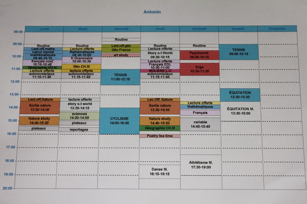 Si en image l’emploi du temps semble chargé et débordant, en réalité les temps sont vraiment courts (entre 15 minutes et 1H (pour les sorties natures et l’étude de la nature). L’idée n’étant pas d’être « à la minute », mais d’avoir un visuel, de permettre à chacun de connaître le programme et de le ritualiser.