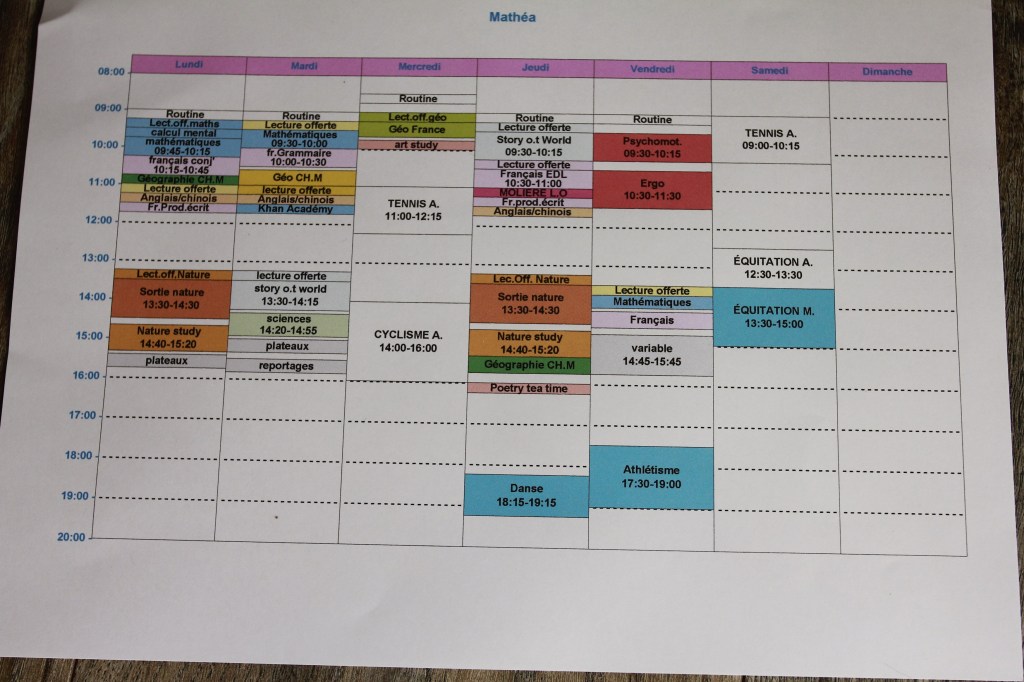 Ça donne un planning un peu plus construit, mais qui laisse toujours une grande marge d’adaptation. Un élément qui me semble essentiel dans notre choix d’instruire nos enfants à la maison. Pouvoir décider au dernier moment en voyant le soleil briller qu’on a envie de profiter du soleil et de la nature qui nous entour, rester plus longtemps avec les amis ou prolonger un goûter, ou organiser une sortie au dernier moment.