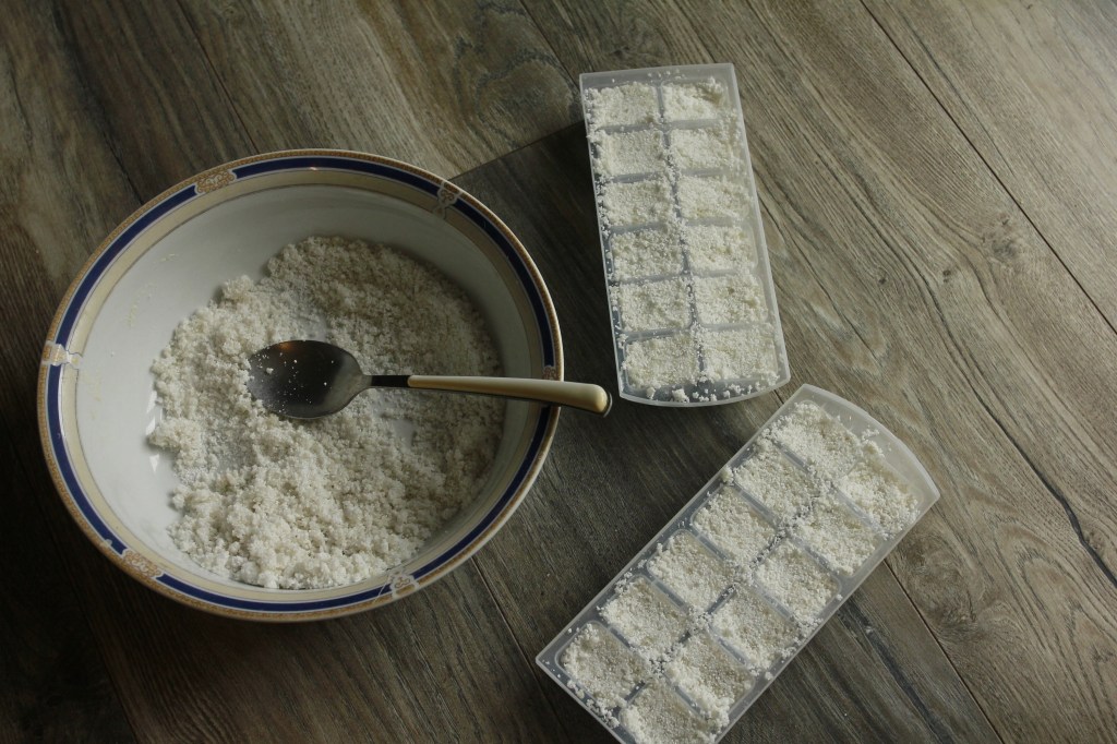 Et on remplit des bacs à glaçons, en tassant bien pour que ça sèche et s’agglomère bien ensemble.