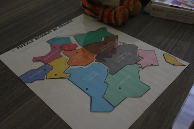 Imprimé et plastifié, il nous sert régulièrement. Je vais donc laisser un plateau avec le support plastifié et les régions de France que j’ai découpé (après plastification), dans un petit bol, pour leur permettre de faire et refaire le puzzle des régions, et d’ancrer au fur et à mesure leurs connaissances.