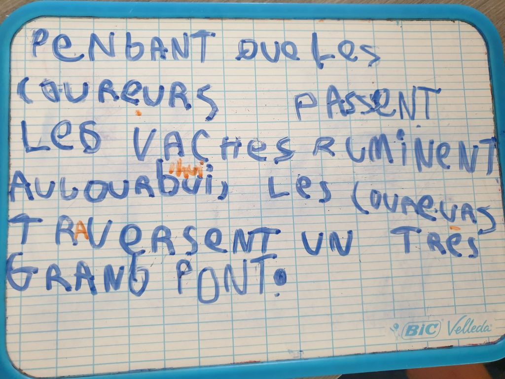Dictées : Pour Antonin, ce sera l’occasion de quelques dictées (sur son ardoise) des mots qu’il aura vu, ou de phrases simples liées au Tour ou au vélo de manière générale.