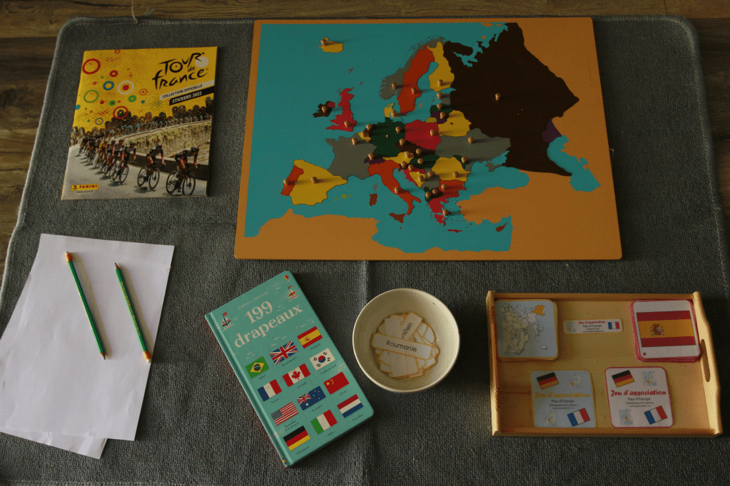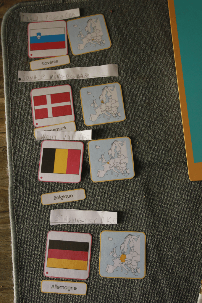 Un jeu d’association de cartes des pays d’Europe et leurs drapeaux. Les cartes sont auto-correctives. En imprimant en recto verso, l’enfant trouve au verso de sa carte pays et drapeau, un symbole identique, et le nom du pays. Un point que j’aime particulièrement sur les activités que je leur propose, pouvoir se corriger par eux-même, sans que l’adulte ne soit à côté ensuite pour contrôler et corriger. Le nôtre vient d’ici https://ludosurlefil.com/produit/jeu-association-drapeaux-cartes-et-pays-europe/?attribute_format=PDF&attribute_cartes-drapeaux=Complet&attribute_etiquettes-noms=Complet