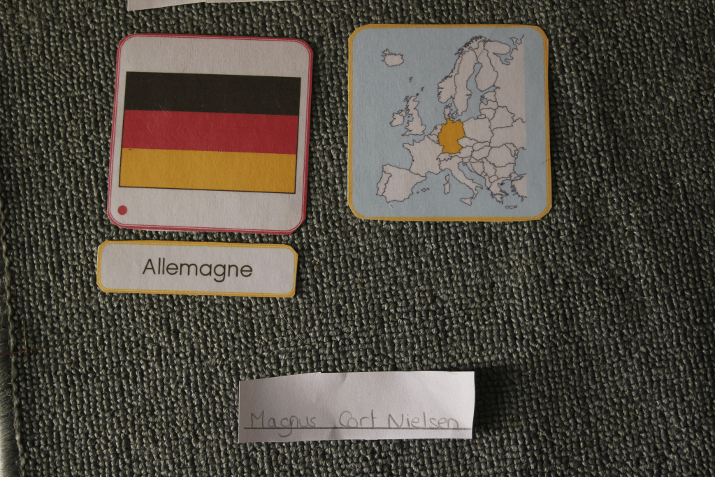 Mise en paire des pays et des étiquettes noms, puis mise en paire avec d’autres cartes qu’on peut avoir sous la main. Ici, cartes des pays/cartes des drapeaux.