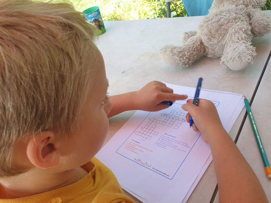 - langage (vocabulaire, dictées (mots ou phrases simples), jeux de lecture (mots mêlés et mots croisés, grammaire (analyse de phrases),