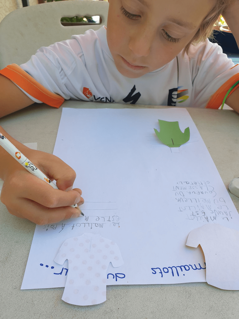 Pour Antonin, je pense partir sur une ou deux images que je prendrai sur internet, et pour lesquelles je lui proposerai d’écrire une ou deux phrases simples pour décrire les images. On a la chance que l’une des étapes passe très proche de chez nous, alors je pense proposer un sujet d’écriture autour de cette journée.
