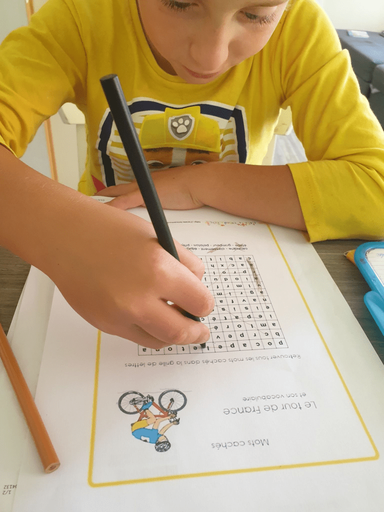 Mots mêlés : pour travailler le langage et le vocabulaire autour du cyclisme et du Tour de France de manière générale. C’est aussi un très bon moyen de travailler la lecture de mots, et à l’enfant de mémoriser l’orthographe du mot. Ce sont des jeux qu’on aime vraiment bien faire ici parce que ça demande à l’enfant de bien regarder/lire le mot puis de le chercher. Il faut qu’il mémorise l’orthographe, quelles lettres se suivent… donc c’est vraiment un moyen sympa de travailler l’orthographe.
