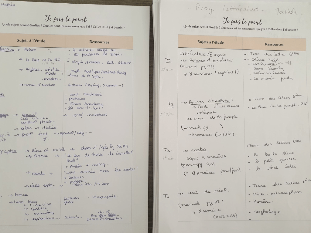 - des pages qui permettent de faire le point pour chaque enfant; Quelles matières, quel(s) niveau(x); mais aussi de noter pour chaque matière quels seront les thèmes abordés, quelles seront les ressources nécessaires; On peut aussi y inscrire quels sujets concerneront un enfant en particulier, et lesquels feront partie d’une étude plus familiale;