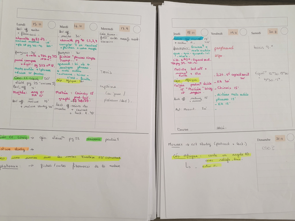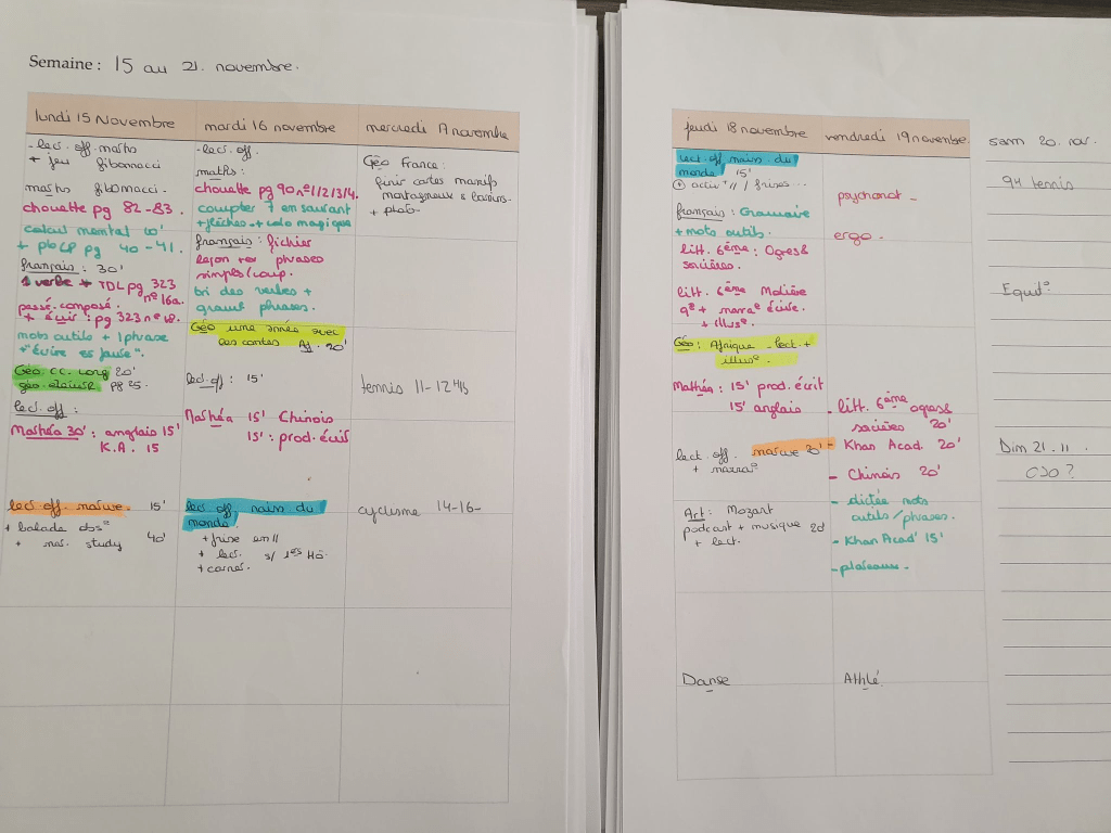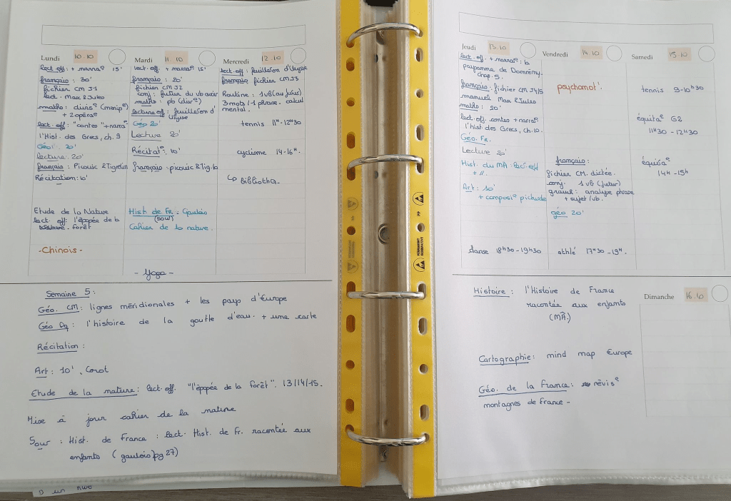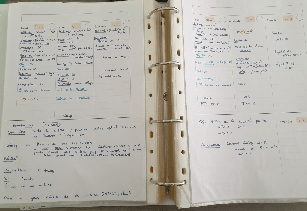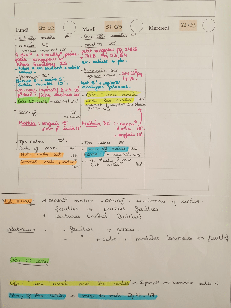 Et je remplis le tableau de l’an dernier pour programmer ma semaine, en inscrivant davantage ce qui correspond à la programmation d’Antonin, puisqu’on fonctionnera un peu différemment avec sa soeur. Je note aussi dans ce tableau (d’une autre couleur) les temps de travail en commun (étude de la nature, géographie, art,…) Et je profite de l’espace libre en bas de page pour détailler quel chapitre sera lu en géographie, en histoire, quel compositeur/artiste sera vu sur la semaine, mais aussi les plateaux/activités de manipulation en autonomie que je préparerai pour la semaine;