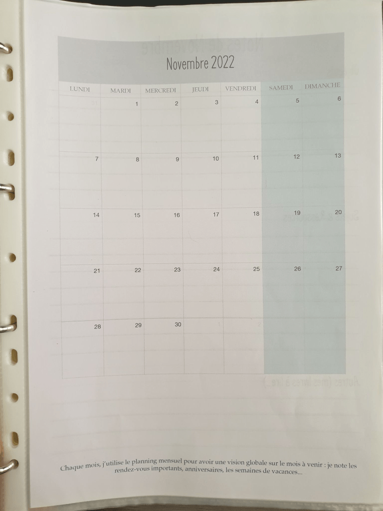 - Un calendrier mensuel pour avoir une visibilité sur le mois à venir; On peut y noter les RDV/les obligations/les sorties/temps déjà pris…