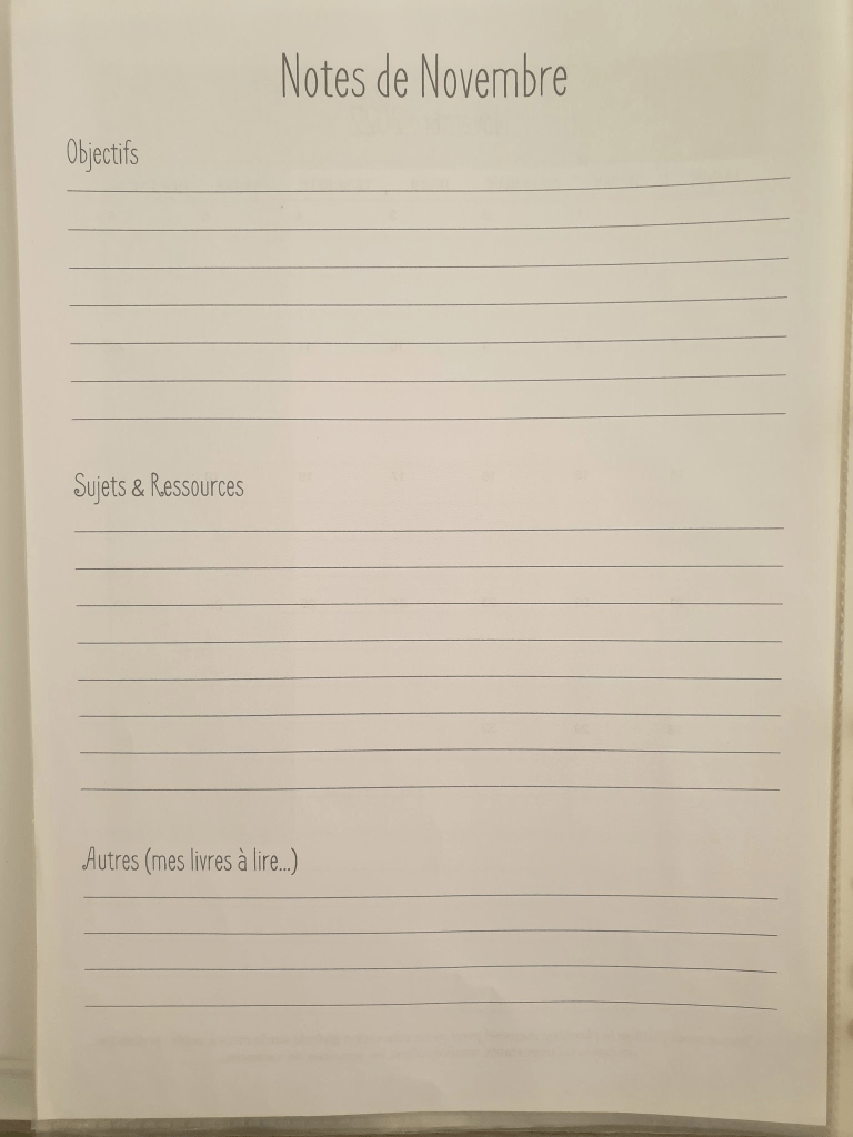 - Une page de notes pour chaque début de mois, où l’on peut rajouter les objectifs/sujets et ressources/etc…