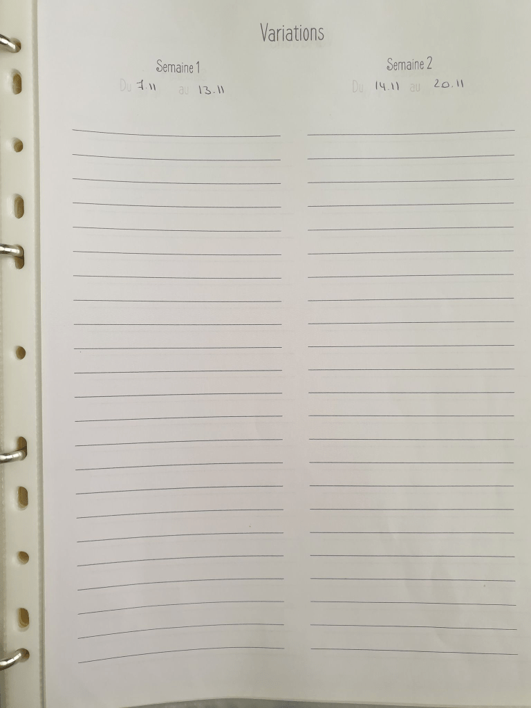 Du coup j’ai choisi de faire à ma sauce et d’utiliser les deux agendas en un; Ce qui est très largement possible puisque les tableaux hebdomadaires/pages des semaines, ne sont pas datés; J’utilise donc les pages organisation et calendriers de l’agenda 2022/2023, ainsi que la page « variations » qui reprend les 4 semaines sur une double page, ET la double page hebdomadaire de l’agenda de l’an dernier; Comme j’ai fait la programmation à la semaine pour Mathéa (sur PC et pour le moment jusqu’à la semaine 8 ou 9), je pense utiliser cette double page semaine pour noter dans les grandes lignes sans détailler son programme (matières/thèmes), et je rajouterai la feuille semaine imprimée de ce que j’ai fait sur le PC;