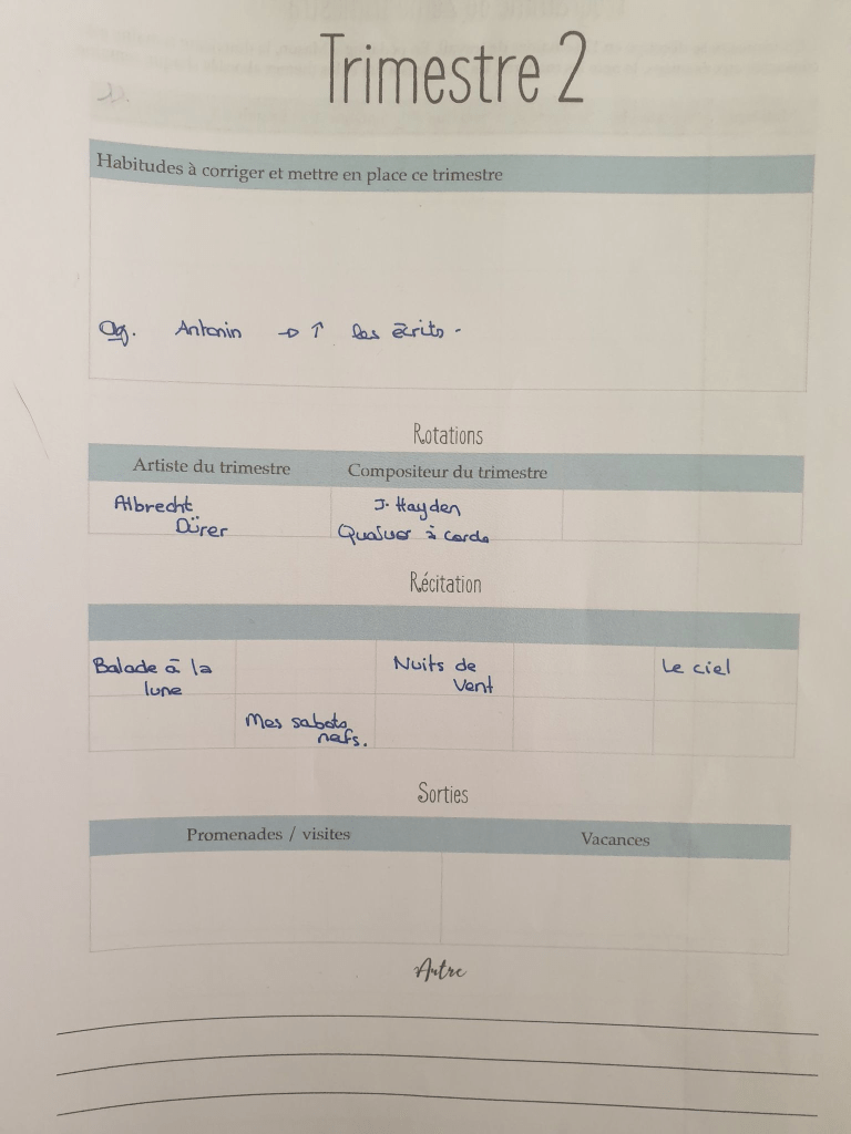 - Une page pour faire le point (habitudes à mettre en place/à corriger), Artistes/compositeurs/récitations/sorties prévus à l’étude pour le trimestre;