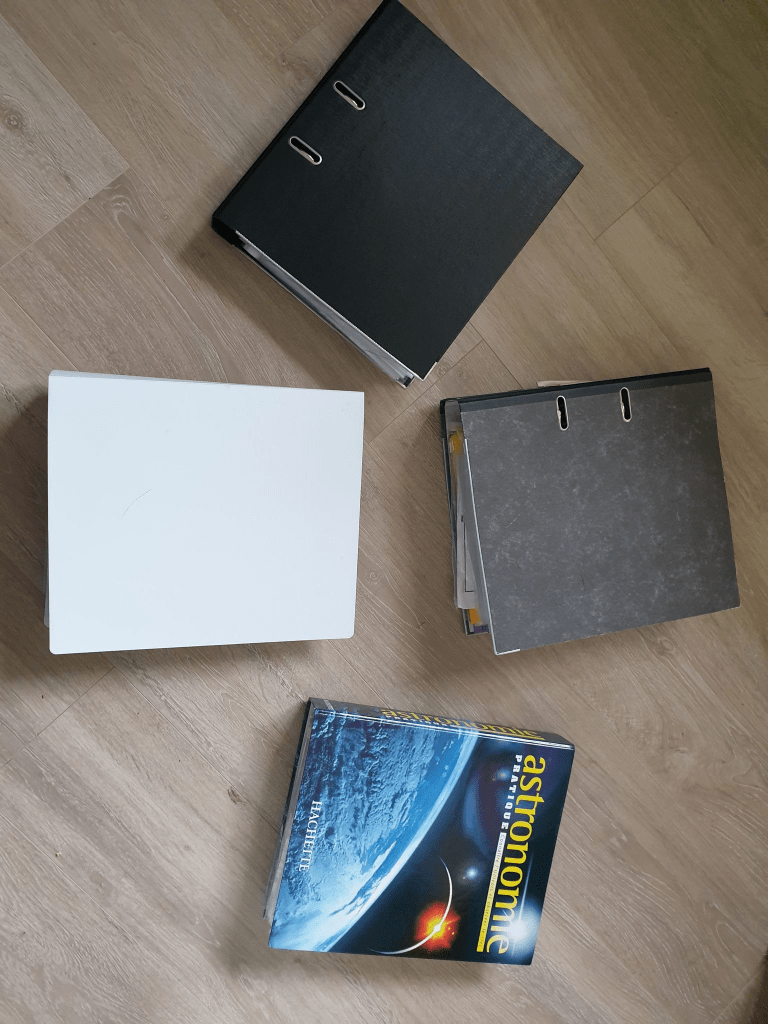 Pour le moment on a 4 gros classeurs : Maths/français/langues, Histoire/géographie/sciences, Art, et le dernier avec un peu de tout ce qui ne rentre pas dans les autres!