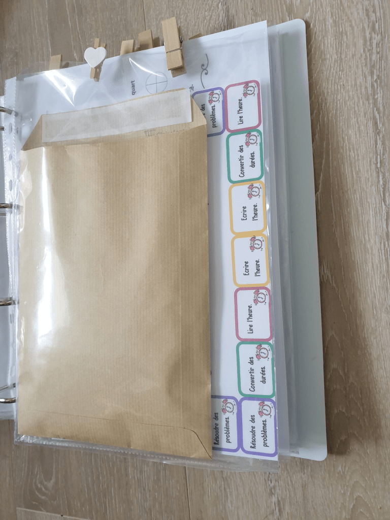 Une fois les fichiers imprimés/plastifiés/découpés, je les met dans une pochette plastique (pour les documents plats (quelque soit le format), et je mets les cartes qui vont avec en enveloppe A5 (si nécessaire, je fais plusieurs enveloppes pour éviter qu’elle ne fasse 10Cm d’épaisseur (j’exagère à peine!). Puis je glisse une enveloppe par pochettes plastiques. Le tout dans un classeur.