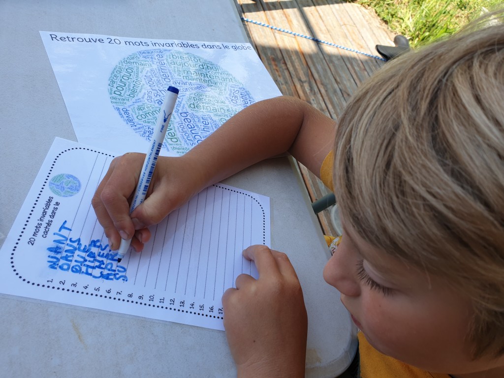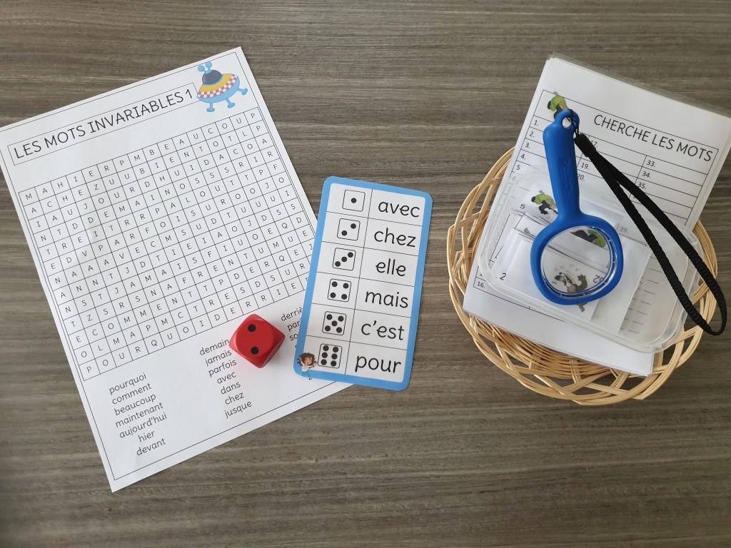 Ce sont des activités dans lesquelles l’enfant est actif. Il utilise ses yeux, mais aussi ses mains, et son corps pour rechercher le mot, le retenir, l’inscrire, ce qui lui permet de le mémoriser à plus long terme. Une façon ludique de travailler l’orthographe et qui, vont lui permettre de se souvenir plus facilement qu’en lisant le mot/le réécrivant pour le mémoriser. L’objectif est de permettre à l’enfant de s’entraîner régulièrement et de manière ludique pour que l’apprentissage ne soit pas ennuyeux et source de frustration (d’autant plus chez les enfants ayant un profil neuroatypique). Chacune de ces activités est rangée dans une petite boîte ou un petit panier à disposition sur l’étagère de langage de manière à ce qu’elle soit réutilisée régulièrement. C’est, à mon sens, le meilleur moyen pour l’enfant de mémoriser ces mots invariables dont l’orthographe n’est pas toujours simple à retenir, mais aussi un moyen de lui permettre de les ancrer véritablement.