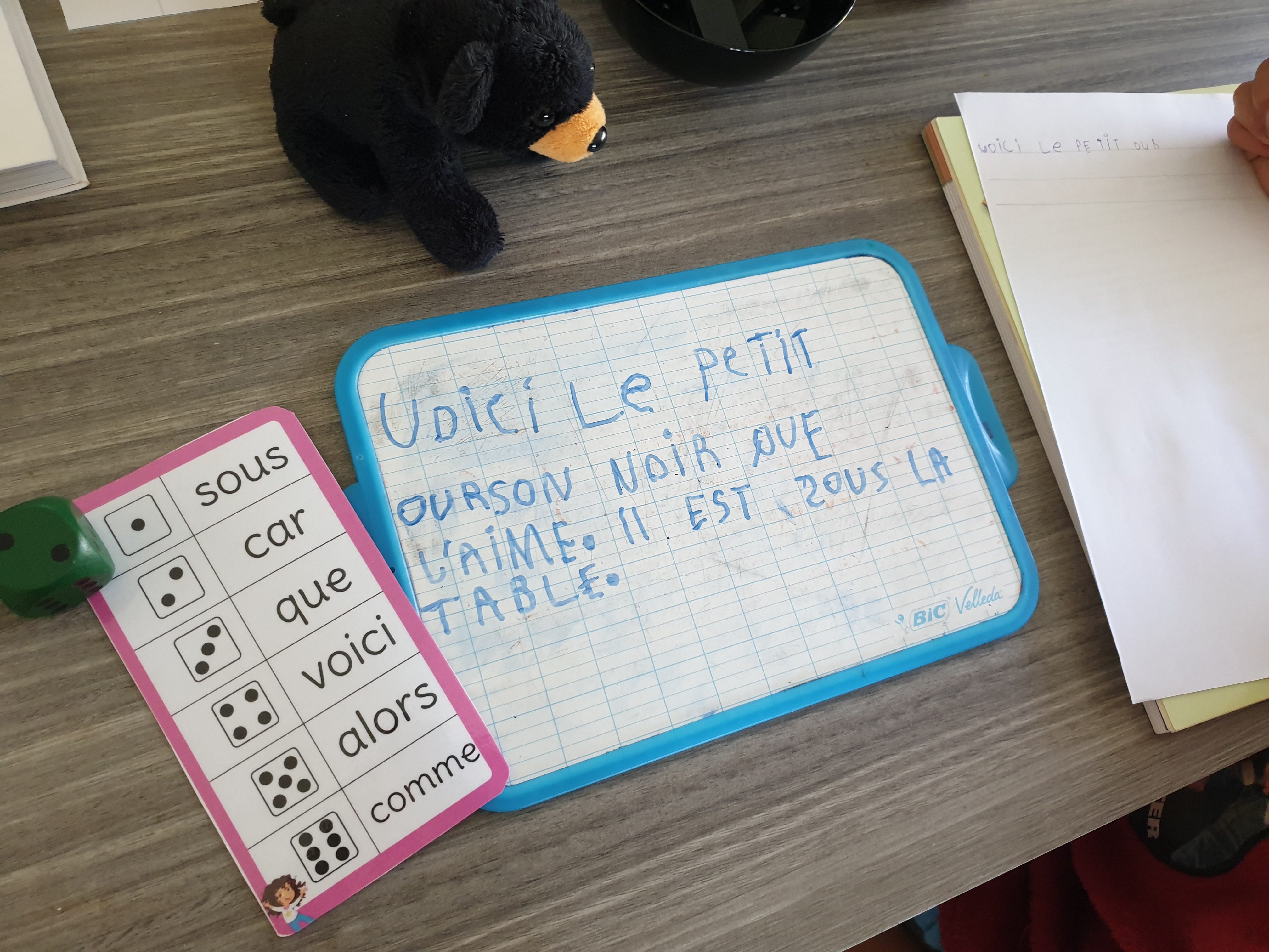 Petit jeu que j’ai proposé à Antonin, et que l’on a mis en place de manière rituelle, une à deux fois par semaine : choisir une couleur (une fiche de 6 mots outils) puis lancer le dé à trois reprises; le dé indique les mots qu’il doit lire/écrire et que je lui dicte ensuite dans une courte phrase.