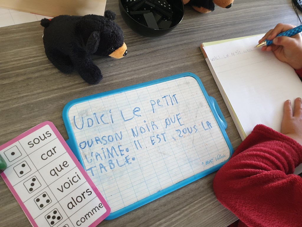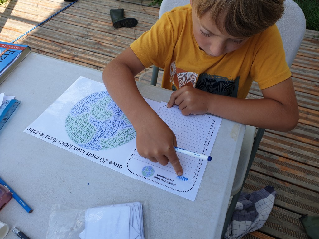 Antonin a plus de difficultés à mémoriser l’orthographe des mots, et ce qui est acquis un jour ne l’est pas forcément le lendemain. Alors on mise sur différentes activités ludiques qui permettent de lire et relire les mots invariables ou mots outils dont on ne peut pas forcément deviner l’orthographe.