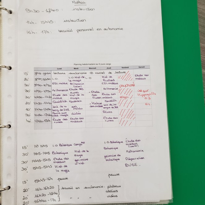 On réessaye donc cette année. L’idée étant qu’elle s’organise comme elle le souhaite dans son travail pour faire ce qui est à faire. Mais plutôt que laisser « libre champ » totalement sur la semaine, elle aura tout de même à faire sur le créneau dédié à la matière en question (histoire d’éviter qu’elle ne fasse de maths ou quelque chose qui lui demande ma pleine disponibilité alors que son frère a besoin de moi). On mixera, on adaptera et on avisera !