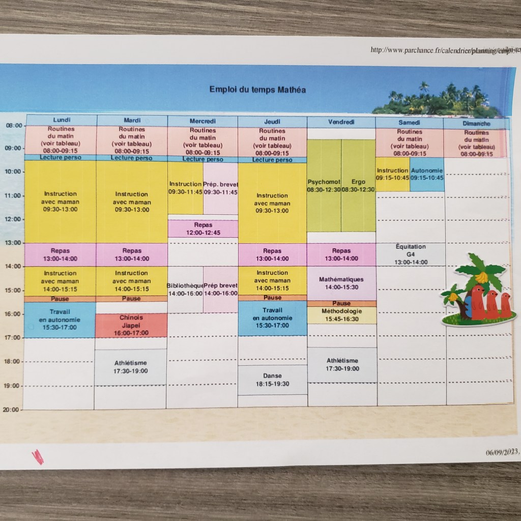 Mathéa a 11 ans cette année et serait rentrée en 6ème qui correspond à la dernière année du cycle 3 en France. Elle a pour objectif de passer son brevet des collègues en juin 2024; il a donc fallu adapter son programme et l’organisation de notre semaine pour l’accompagner dans cet objectif.