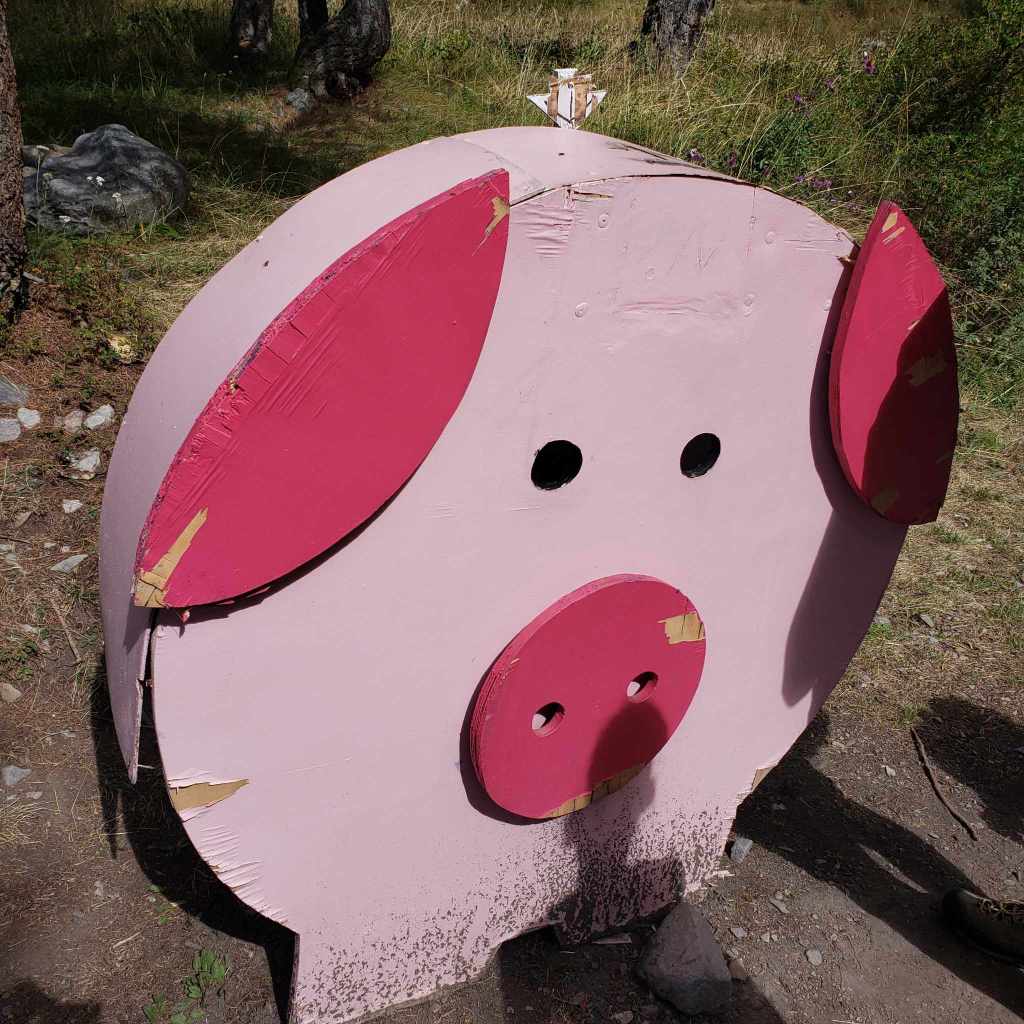 Un petit cochon géant attend les quelques piécettes demandées à l’entrée du sentier et qui permettent de soutenir cette initiative et les artistes qui y participent depuis 2010.