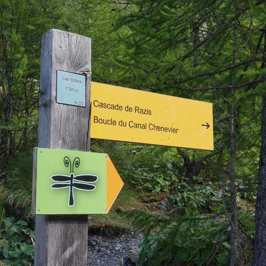 Une boucle qui mène jusqu’à la magnifique cascade de Razis (attention les jambes, ça grimpe pas mal sur les derniers mètres, mais la vue en vaut vraiment la peine!). Passant par dessus/longeant le Crévoux sur la moitié du trajet, traçant à travers les bois au retour, on y découvre au fil du chemin les différentes œuvres d’art construites par les artistes qui participent à se projet. Une chasse au trésor que les enfants ont pris beaucoup de plaisir à suivre ; Un bon moyen de les faire avancer quand la fatigue peut se faire sentir : se diriger vers la prochaine œuvre !
