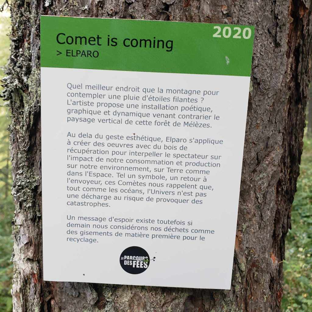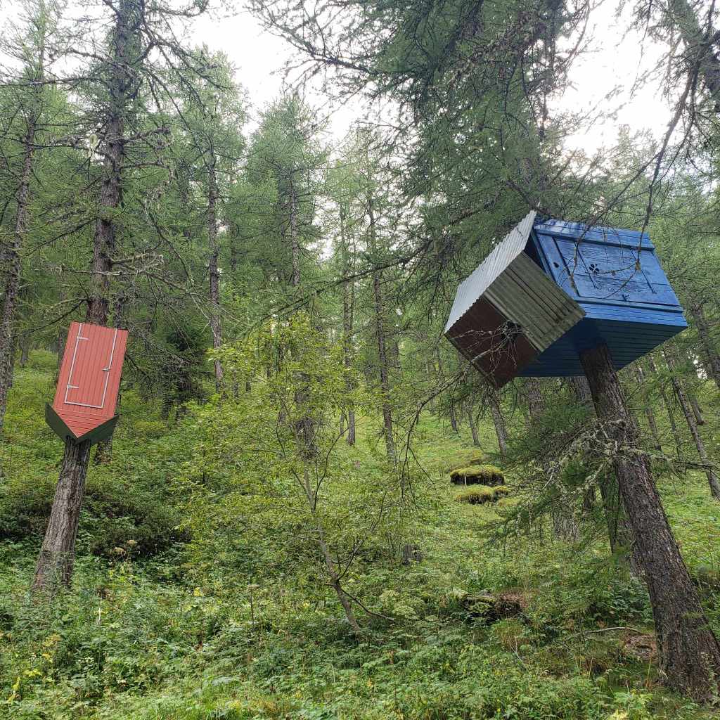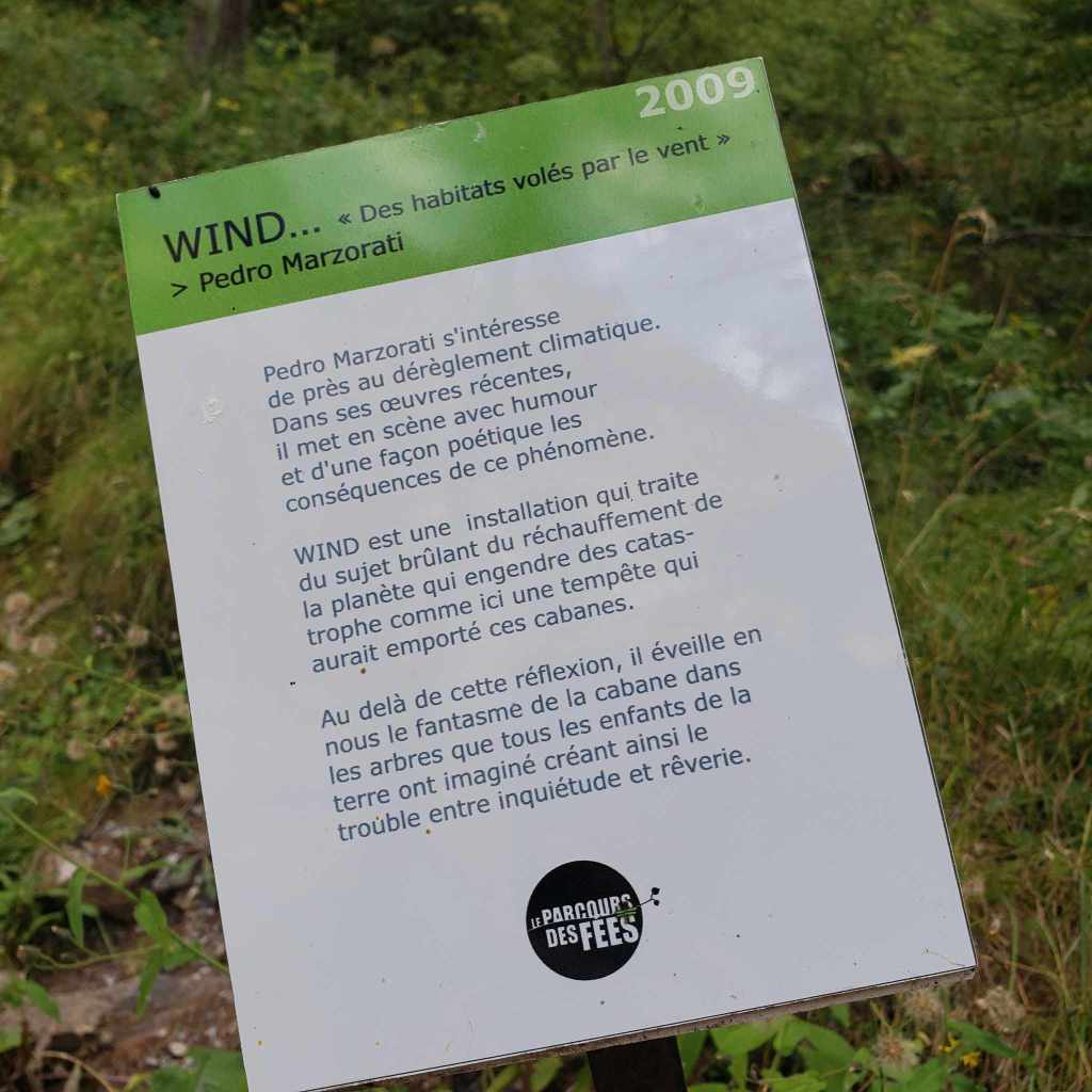 Un parcours qui incite à s’interroger sur la place de l’être humain dans la nature ; Une nature sauvage et préservée dans cette partie des Hautes-Alpes; Des questionnements d’actualité, et une manière de les aborder parfois très surprenante voire dérangeante ; Des éléments qui viennent nous interpeller sur l’empreinte que laisse l’humain et sa technologie, son mode de vie, son impact; des représentations qui viennent se poser comme rappel de ce qui pourrait bien arriver en laissant le climat se dégrader de la sorte comme ses cabanes dans les arbres qui représentent des habitations qui se seraient envolées lors d’une tempête ;