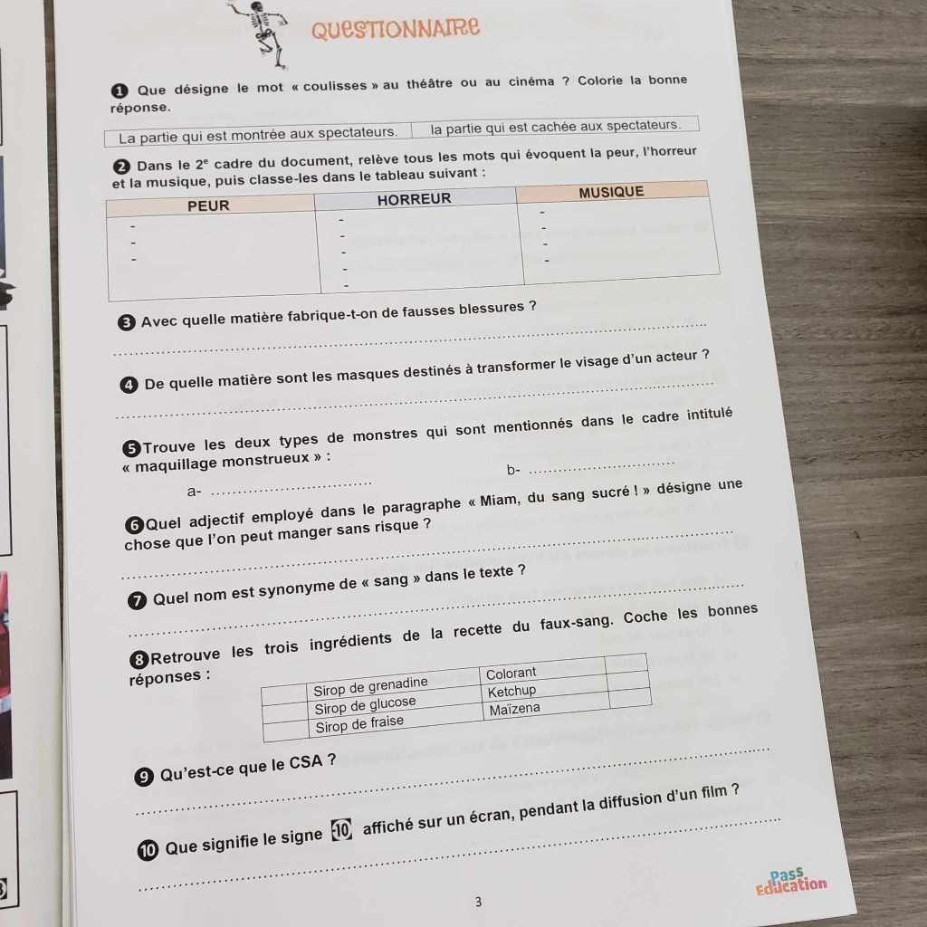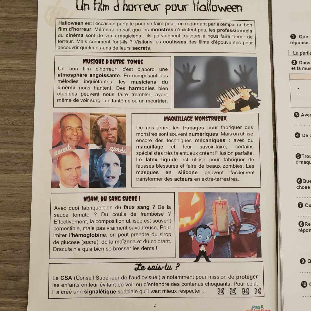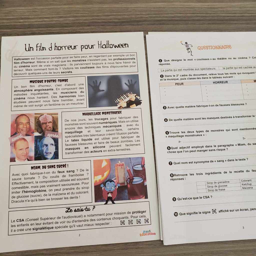 Les cahiers conçus pour accompagner les enfants sur ces deux semaines de congés d’automne mettent en avant les petits trésors de cette belle saison (ma saison préférée ici), et cette célèbre fête qu’est Halloween et qui plaît en général beaucoup aux enfants ! Un thème qui justement plaît beaucoup ici, et qui, donne son côté sympa pour les ados qui ont parfois tendance à trouver les cahiers de vacances ou révisions durant leurs vacances barbants ! Halloween, on se fait peur (gentiment), on découvre le monde des films d’horreurs, du cinéma, de l’art de créer des effets spéciaux… des sujets que j’ai trouvé sympa à proposer pour les plus grands justement. Ils aiment Halloween pour les bonbons, pour ce côté « se faire peur »/ »effrayant », un moyen de tester leurs limites aussi, alors c’est la bonne occasion pour s’informer sur la manière de réaliser un film d’horreur, de découvrir le CSA et ses mises en garde pour protéger les plus jeunes, etc. Tout un vocabulaire, des techniques, qui sont ainsi mis en avant dans les fichiers conçus pour les collégiens.