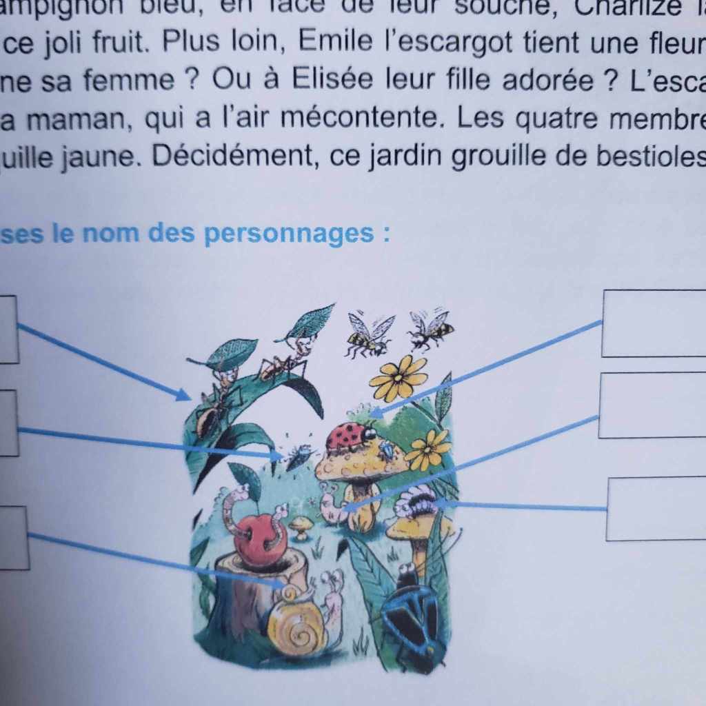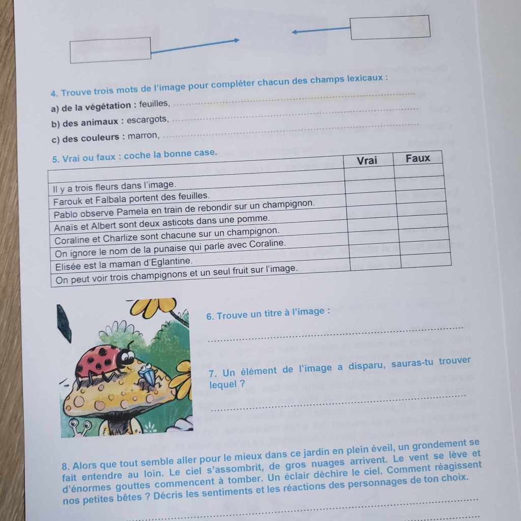 Et ce sont justement dans les détails que se cachent les informations à mémoriser. À l’enfant ensuite de compléter un texte en replaçant les mots manquants correctement dans les phrases, de dire si certaines affirmations (concernant l’image observée) sont vraies ou fausses (il lui faut donc lire l’affirmation, la comprendre et la confronter à ses observations) ; À lui de lire un texte décrivant l’image, et d’y relever les erreurs : « la fraise rouge » alors que l’asticot sort d’une pomme rouge. Il lui faut donc prendre le temps de lire le texte et être attentif à chaque mot ; mais là encore pas de vérification de sa compréhension par des questions que l’on trouve habituellement (qui a fait quoi/qu’est ce qui se passe/…). Via ce genre d’activités, on permet donc à l’enfant de lire et utiliser les informations obtenues de manière concrète sans lui donner l’impression qu’il lui faut impérativement passer par tout un tas de questions;