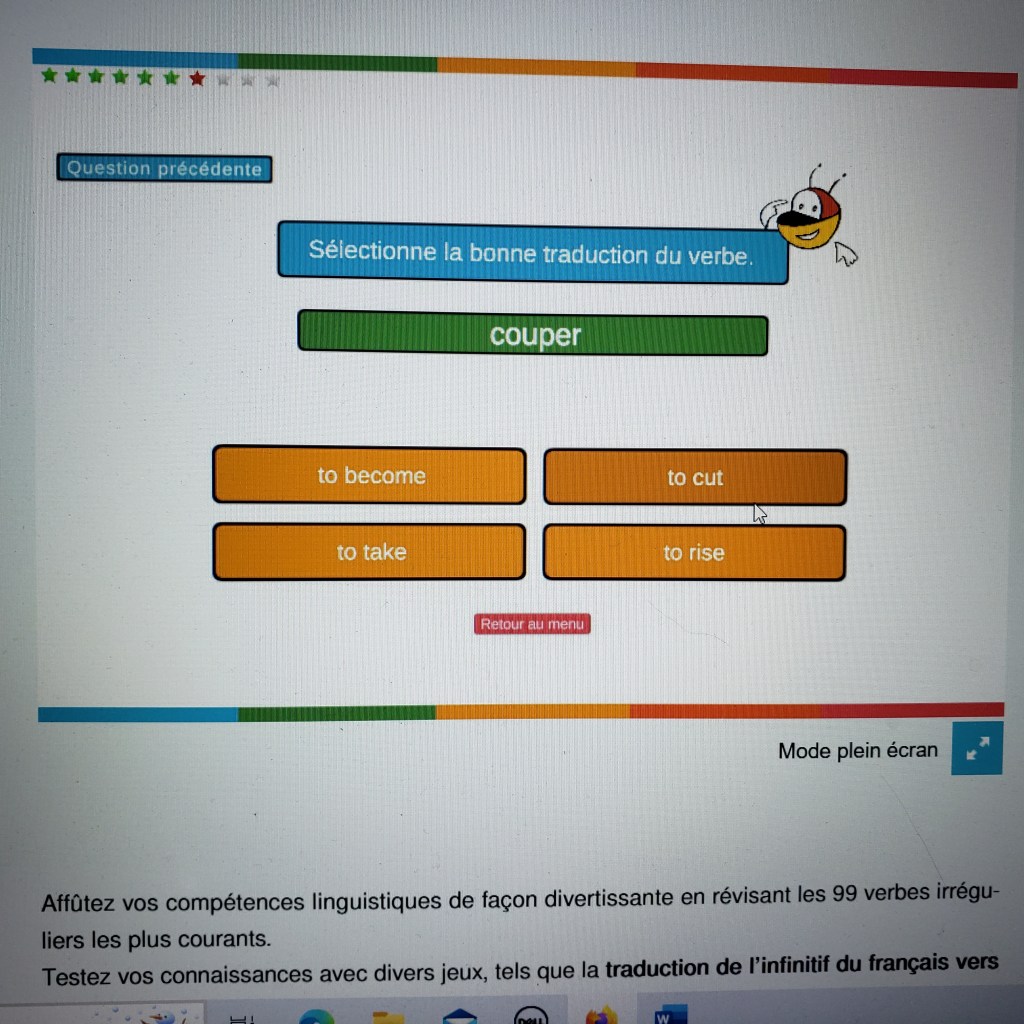 Traduction anglais/français : Le verbe est donné en anglais, à l’enfant de trouver la bonne traduction entre quatre verbes proposés en français.