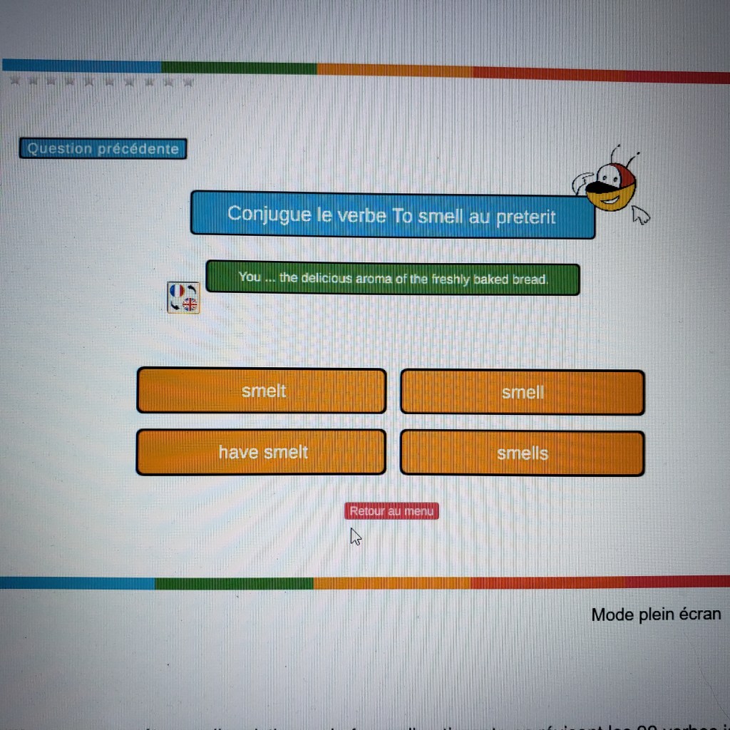 Coche la bonne conjugaison : Une phrase complète est écrite en anglais, à l’enfant de trouver la bonne forme du verbe au temps demandé dans la consigne (en haut en bleue en français) ; Quatre choix sont proposés.